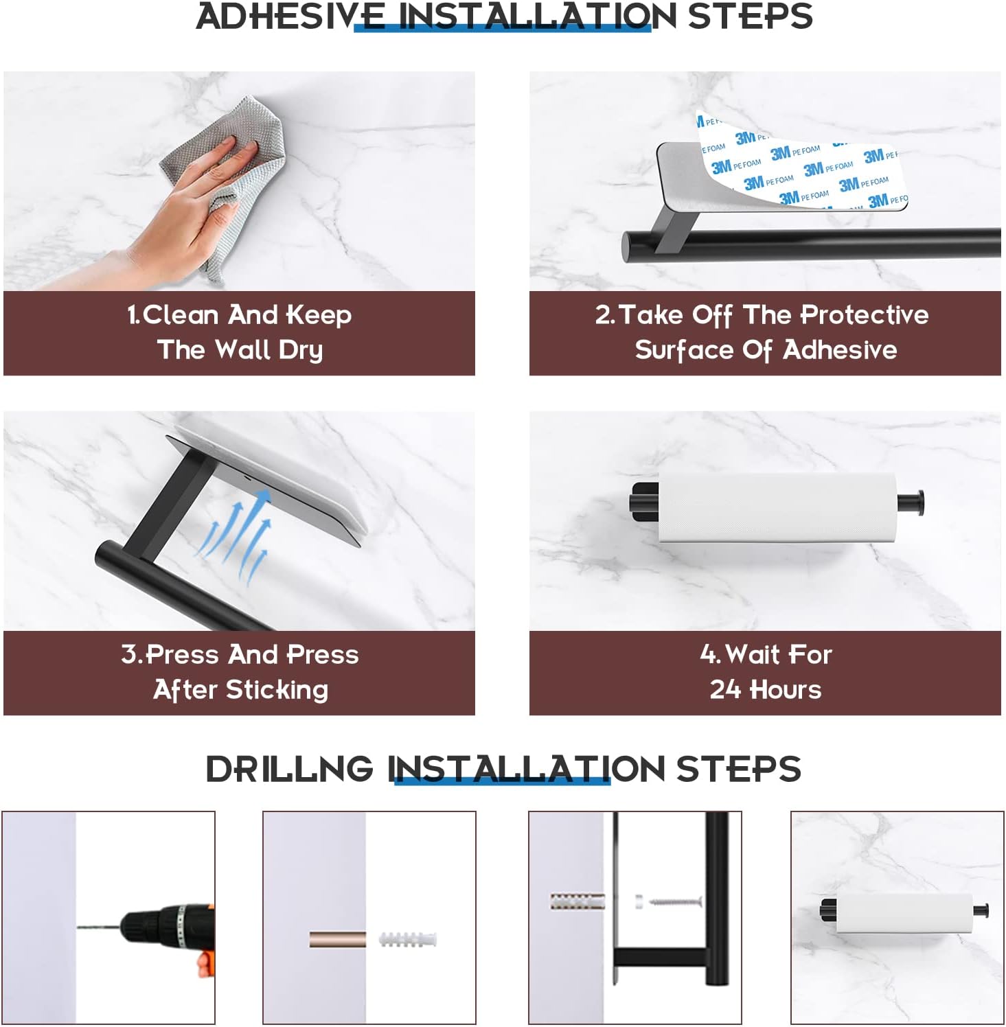 - ☞【Multiple Installation Options】: Applicable for both adhesive and screws. Self adhesive paper towel holder design suits smooth surfaces as tiles, glass, wood, marble, metal. Install and fix with auxiliary stickers, press stick on paper towel holder for about 20 seconds then use it after 24 hours. On rough surfaces, paper towel holder wall mount can be installed with screws