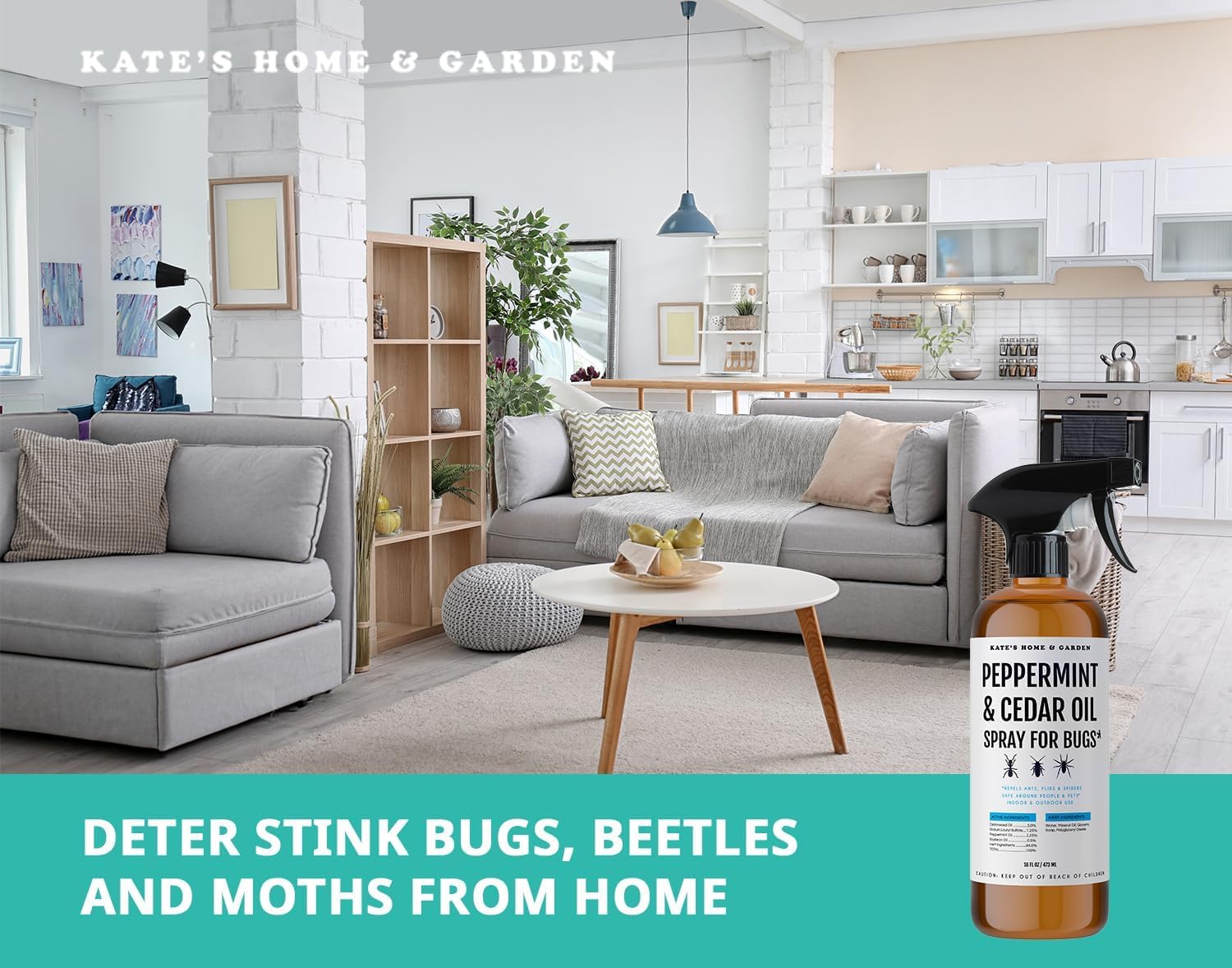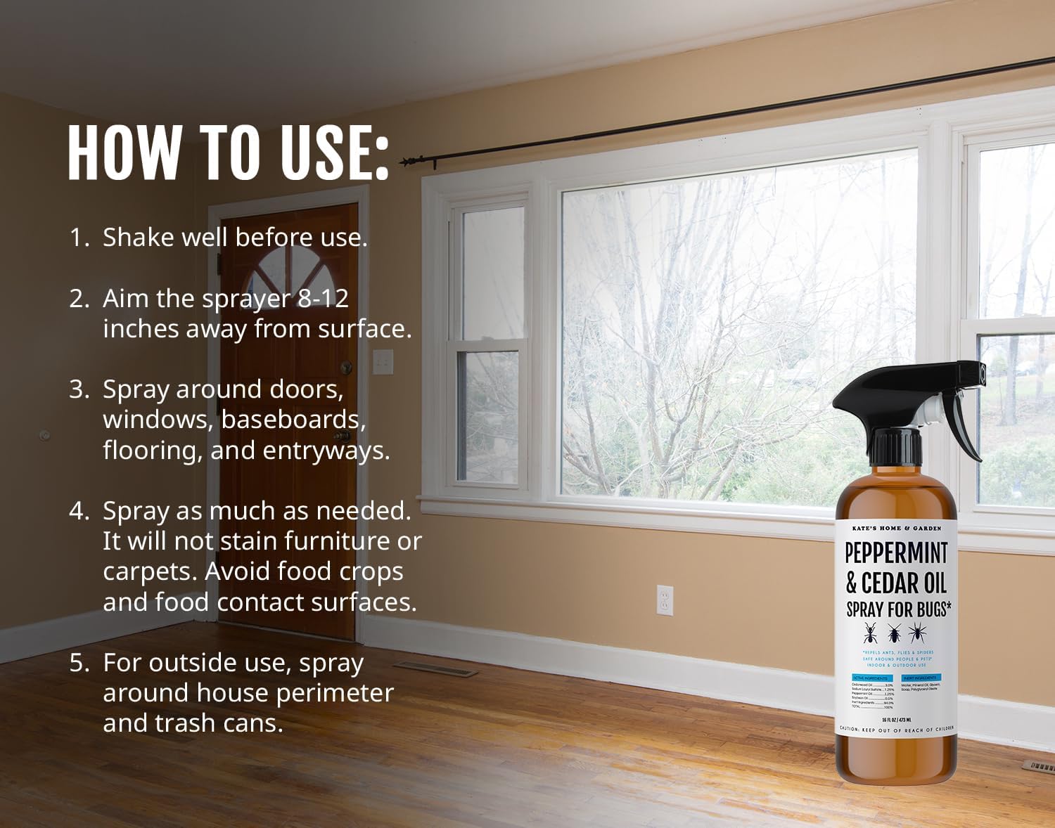 - PEPPERMINT OIL SPRAY FOR BUGS: This natural bug repellent is made with peppermint oil and cedarwood oil for pest control; it works indoor and outdoor by repelling bug, spiders, stink bugs, earwigs, flies, cats and rodents from crawling over all your house, basement, attics, and yard; this is why Kate's Home & Garden insect repellent is a great indoor insect & pest control spray for insects and is a great household supply and camping essential because it's a natural ant killer and has a clean fresh smell