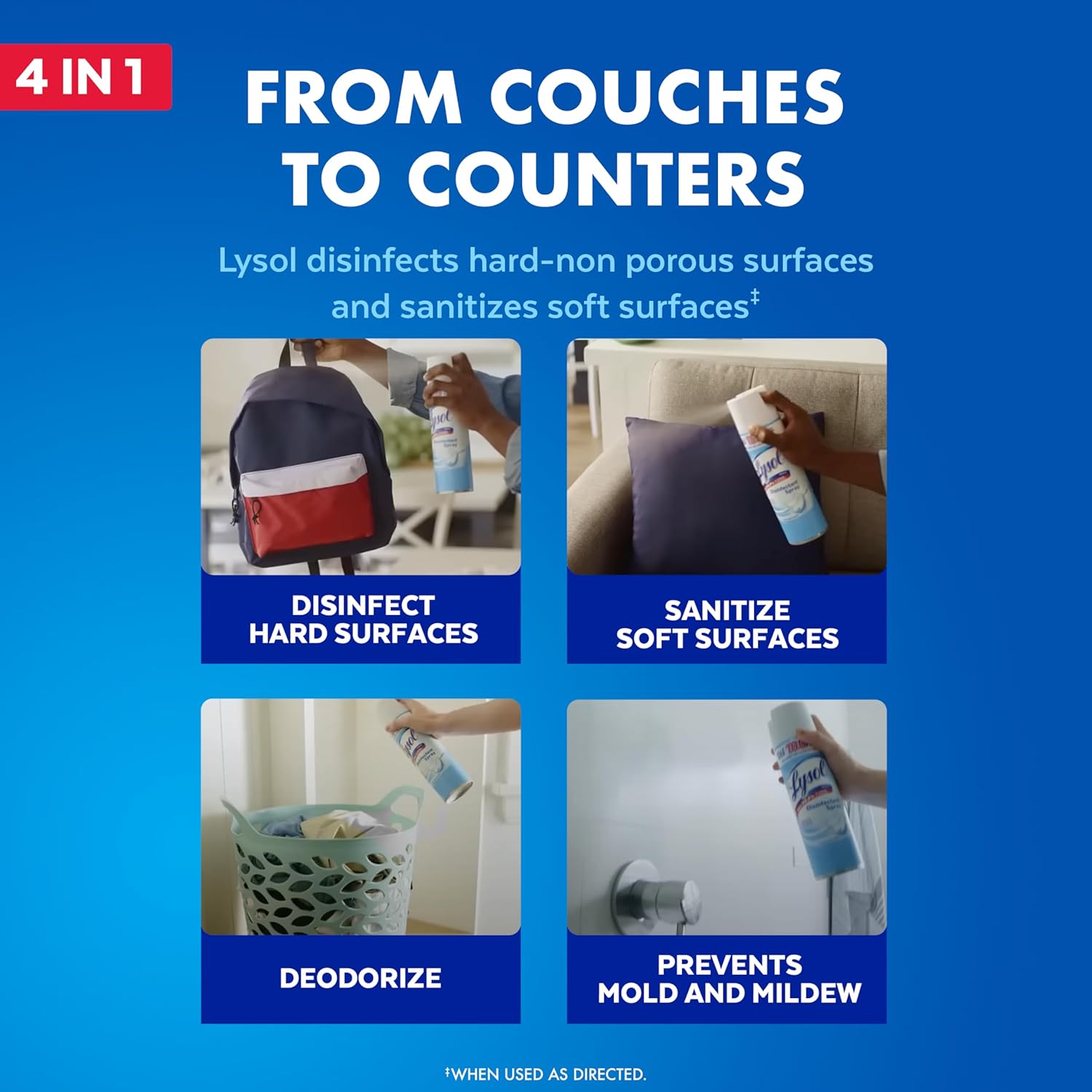 - FRESH SCENT: Lysol neutralizes tough odors and adds a fresh scent. Use this product daily to sanitize your soft surfaces. Leave behind a crisp linen scent, effectivley replacing odors and refreshing your space with a clean fragrance.